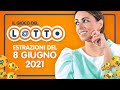 Estrazioni Lotto, SuperEnalotto e 10eLotto oggi 8 giugno 2021: numeri vincenti e quote     Sale a 37,6 milioni di euro il jackpot del SuperEnalotto per chi centra i 6 numeri vincenti, quote e vincite a seguire. Vediamo anche i numeri estratti ...